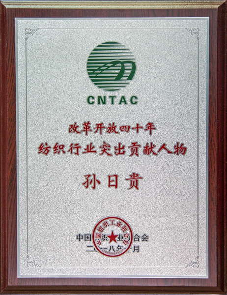 2018年10月16日,中國紡織工業聯合會第四屆第四次常務理事擴大會議在上海召開,公布140位“改革開放40年紡織行業突出貢獻人物”。 中國紡織工業聯合會特邀副會長、孚日控股集團董事長孫日貴榜上有名、登臺領獎。